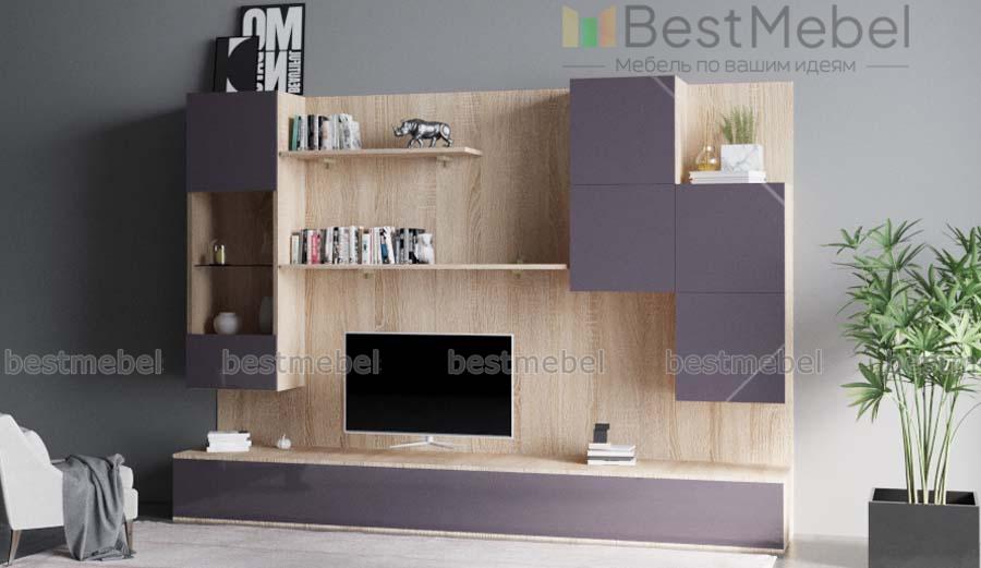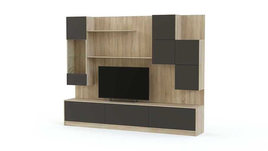 Стенка для гостиной Ева М BMS поможет нестандартно оформить зону ТВ в интерьерах стиля минимализм или лофт. Эффектная геометричная композиция включает в себя широкую низкую тумбу под ТВ с выдвижными ящиками, открытые книжные полки, навесную витрину и шкафчики с глухими распашными отделениями, закрепленные на задней панели. Контрастные древесные тона скомбинированы с нейтральными серо-графитовыми. Купить стенку для гостиной Ева М BMS по выгодной цене приглашаем на сайт нашего интернет-магазина.