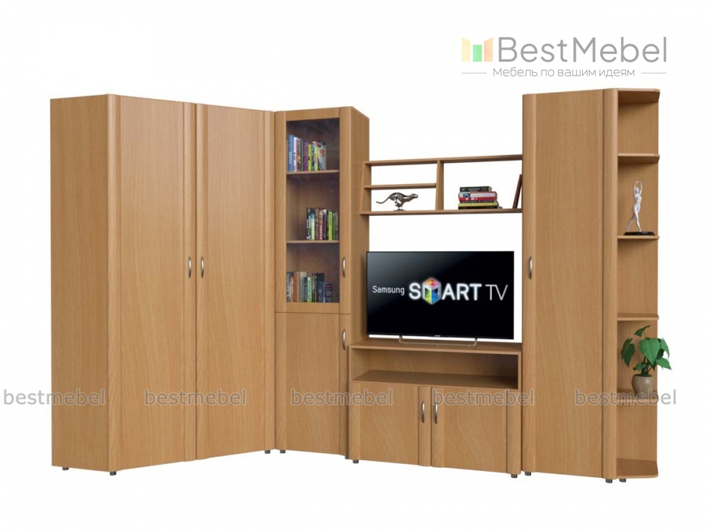 Стенка-горка угловая Хит № 6 BMS гармонично впишется в интерьер малогабаритных гостиных благодаря компактным размерам и практичной форме. Теплые древесные тона корпуса и сборных фасадов помогут создать комфортную, уютную атмосферу. Композиция включает в себя распашные шкафы для одежды, комбинированную витрину, торцевой стеллаж, тумбу под ТВ и навесную полку для книг и декоративных мелочей. Износостойкие материалы и надежность конструкции станут гарантией долговечности. Купить стенку-горку угловую Хит № 6 BMS приглашаем в наш интернет-магазин.