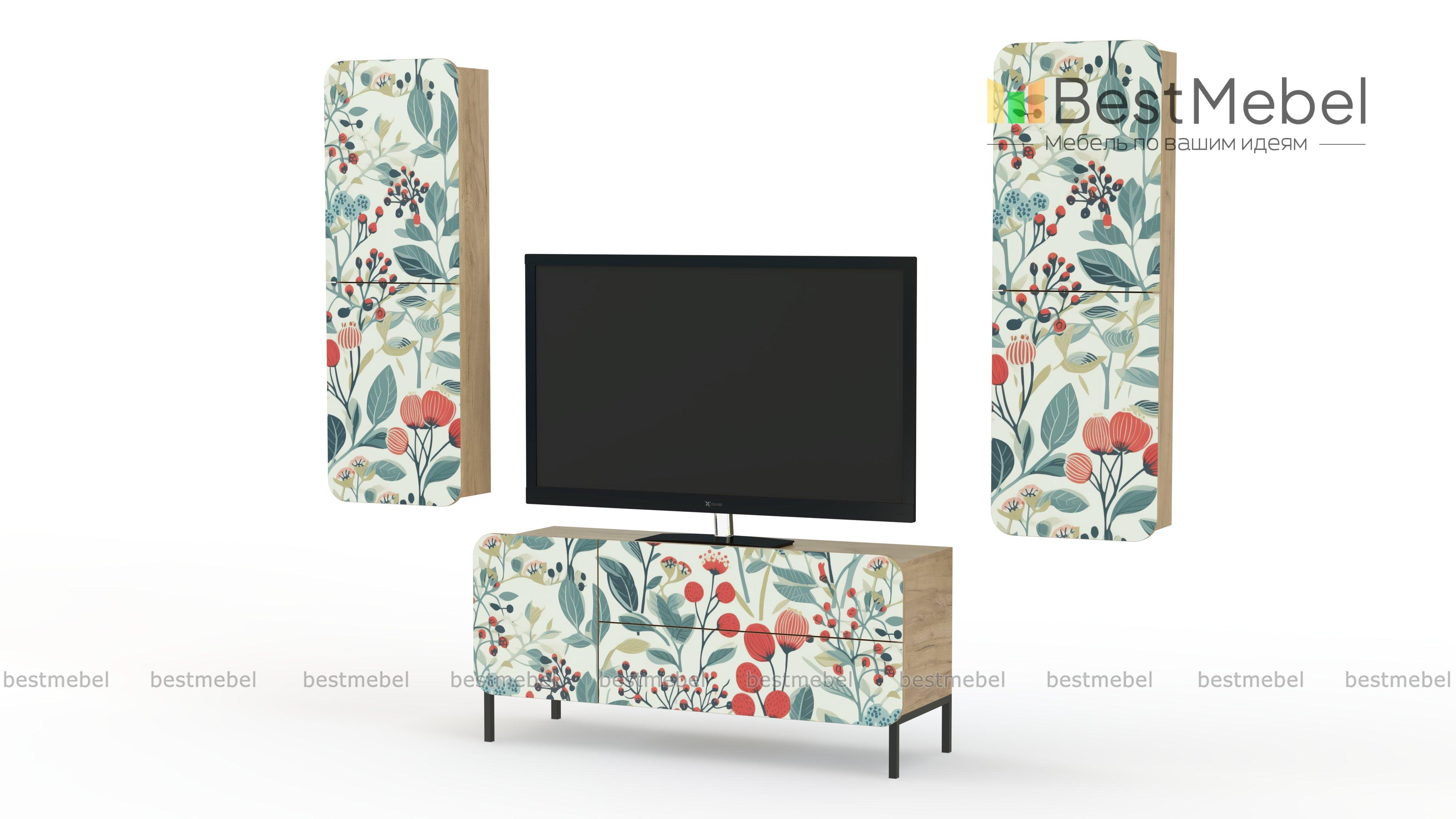 Стенка Риетта 15 BMS визуально не утяжеляет пространство и оживляет интерьер в стиле сканди или минимализма. В комплект для обустройства телезоны входят два навесных пенала с распашными дверцами и тумба на высоких ножках из окрашенного в контрастный цвет металла. Особенную выразительность модульной композиции придают скругленные фасады с ярким растительным принтом. Купить стенку Риетта 15 BMS, изготовленную по вашим размерам, приглашаем в наш интернет-магазин.