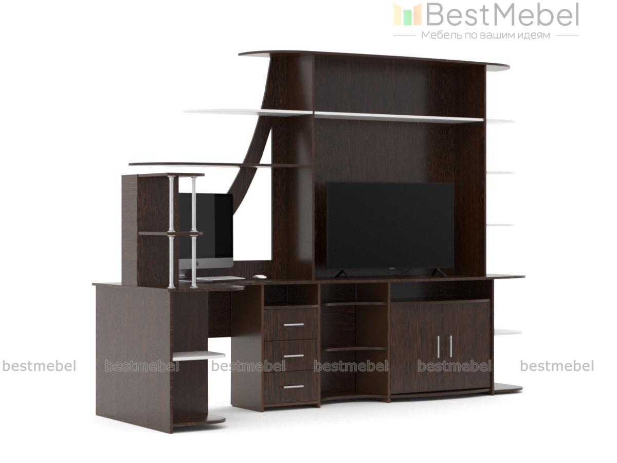 Стенка с рабочим местом Марта 14 BMS смотрится эффектно в темном оттенке венге с фигурно вырезанными элементами и радиусными полками. Угловая композиция позволит вам выгодно использовать особенности планировки и вписать в интерьер рабочее место и телезону. В комплект входят компьютерный стол с надстройкой, широкая тумба под аппаратуру и секция с открытыми книжными полками и просторной нишей для ТВ. Купить стенку с рабочим местом Марта 14 BMS для элегантного современного интерьера приглашаем в наш интернет-магазин.