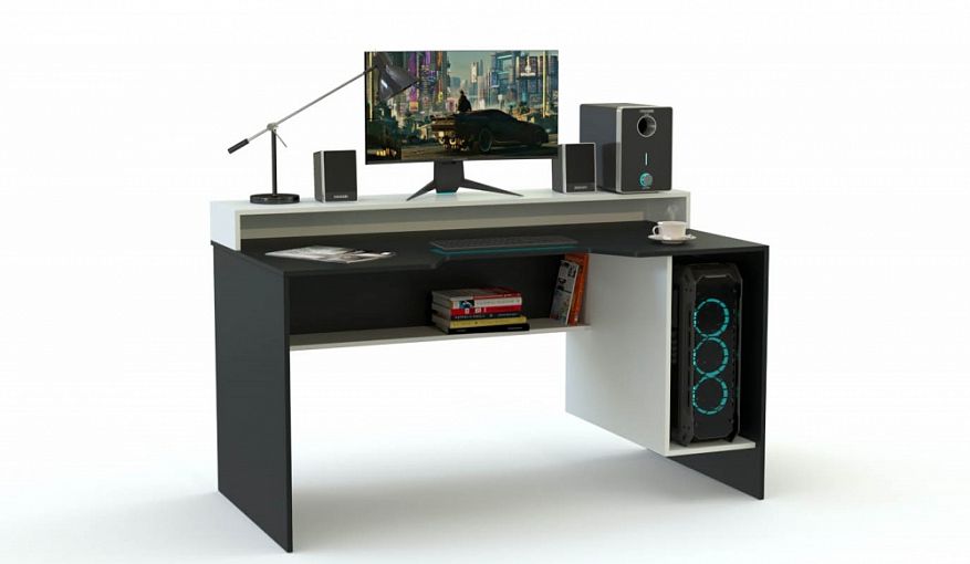 Геймерский стол Свон-3 BMS выполнен в черно-белой гамме и эффектно дополнит минималистичные интерьеры. Столешница с трапециевидным вырезом переднего края дополнена надстройкой, которая дает возможность разместить монитор и периферийные устройства, освободив рабочую поверхность. Под столешницей располагаются открытые секции для системного блока и рабочих материалов. Купить геймерский стол Свон-3 BMS с учетом необходимых размеров приглашаем в наш интернет-магазин.