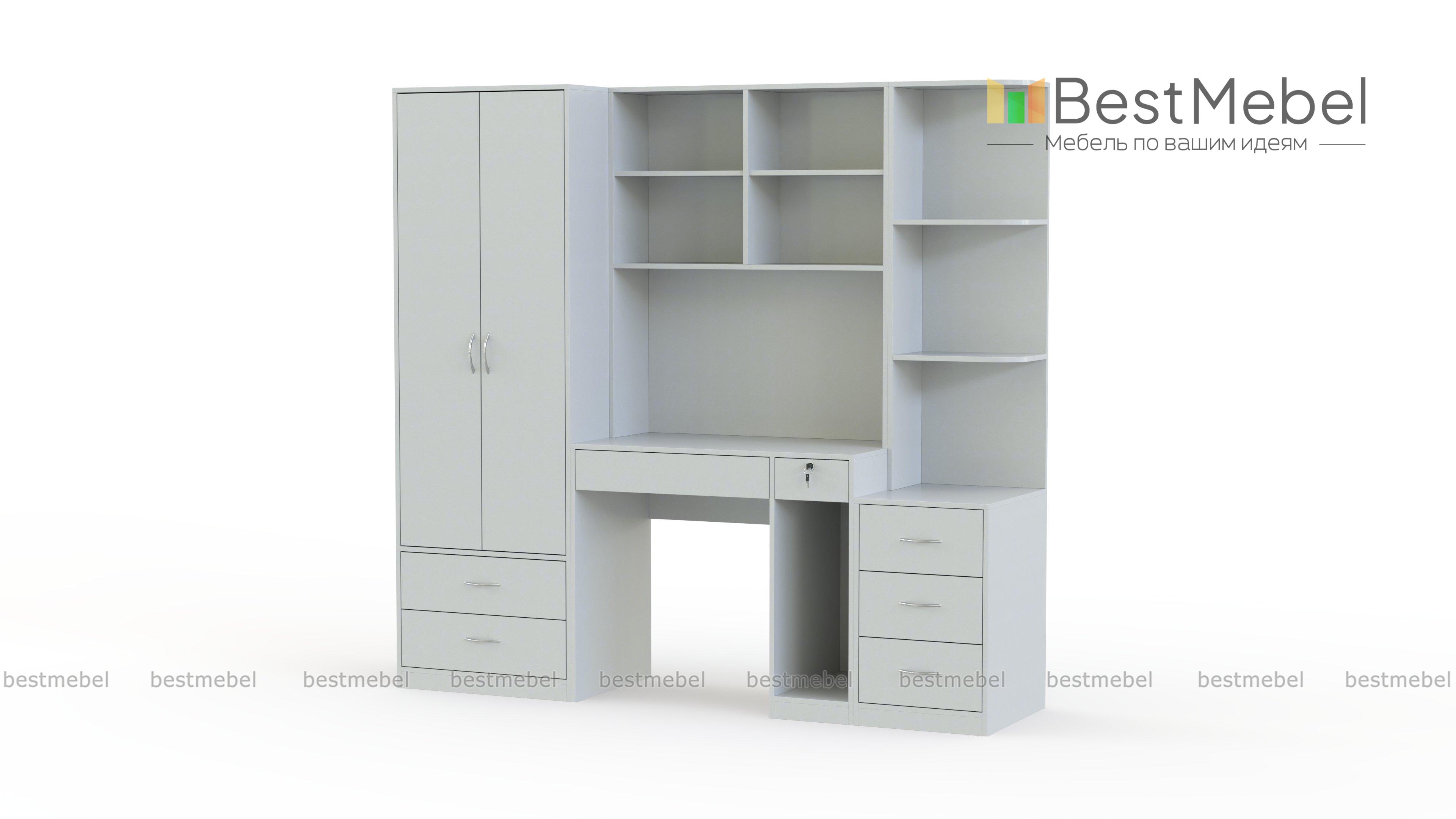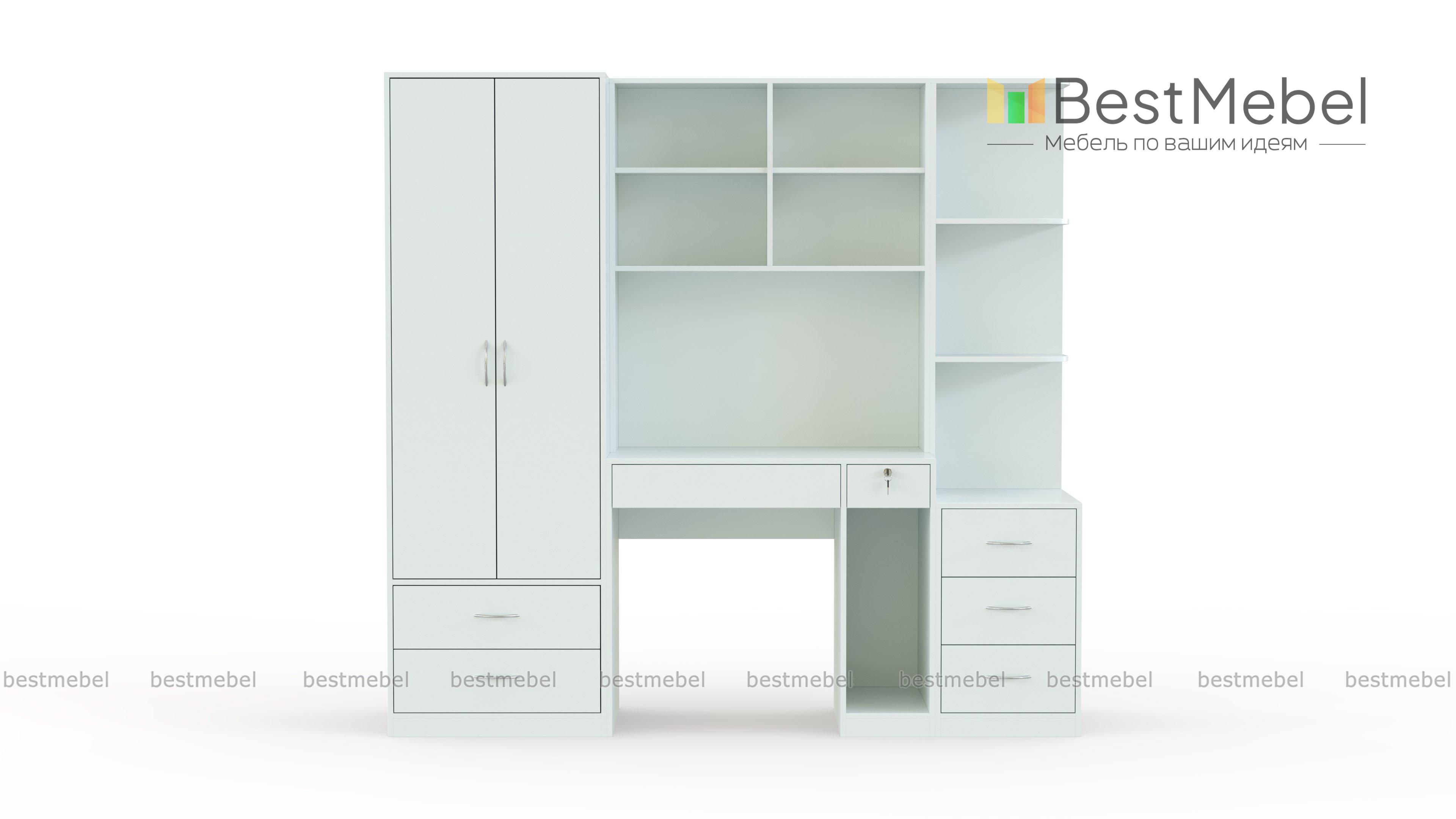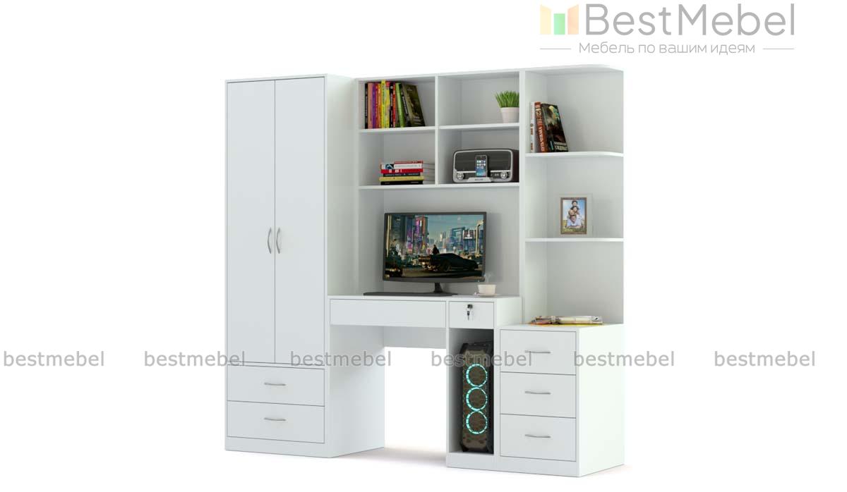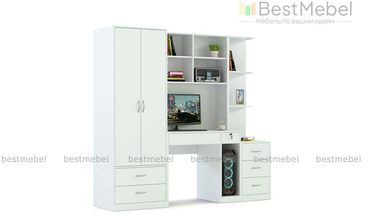 Компьютерный стол Марта 4 BMS дополнен продуманной системой хранения и будет особенно актуален в малогабаритных помещениях. В центре композиции располагается компьютерный столик с книжными полками и банкеткой, а по бокам – двухдверный платяной шкаф с выдвижными ящиками в основании и секция с тумбой и открытыми полками для разнообразных мелочей и предметов декора. Купить компьютерный стол Марта 4 BMS, выполненный в универсальном белом цвете, вы сможете в нашем интернет-магазине по доступной цене.