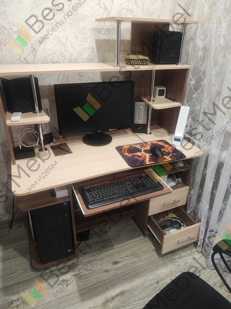 Приобрел данный стол пару месяцев назад. Стол очень понравился. Только полочку вторую снизу можно было бы сделать поуже, чтобы колени не упирались. Так же понравилось что на сайте можно самому конструировать и подбирать что тебе надо. А потом ещё и в 3d посмотреть. Номер заказа 00000919488.