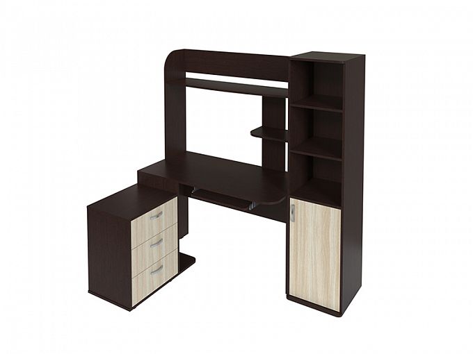Если Вам сложно определиться с выбором стола, то обратите внимание на СС 12.21. Данная модель включает стеллаж с 3-я открытыми полками и распашным шкафчиком, а также 3 ящика, которые станут хорошим местом для хранения папок с документами, гаджетов, рабочих материалов. Рабочая зона состоит из ниши для системного блока, панели для клавиатуры, полки на возвышениях, встроенной колонны для дисков. Столешница достаточно большая для размещения монитора и выполнения письменной работы. Заказать модель можно на сайте.