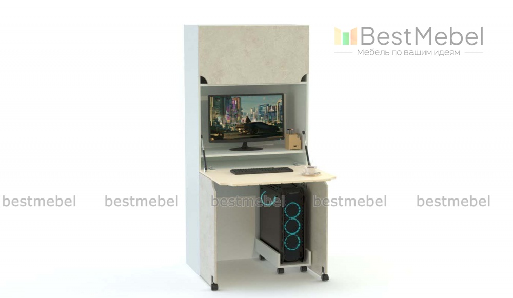 Компьютерный стол-трансформер Галатея 5 BMS поможет вам рационально организовать пространство и оборудовать комфортное рабочее место даже в небольшом помещении. Модель, выполненная в актуальных оттенках и украшенная фрезеровкой, внешне напоминает шкаф и занимает немного места. Откидная столешница и выкатные опоры легко превращают его в полноценное рабочее место с нишей под монитор и антресолью для хранения материалов. Купить компьютерный стол-трансформер Галатея 5 BMS вы всегда сможете на сайте нашего интернет-магазина.