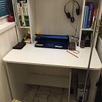 Стол хорошего качества, хорошо вписывается в интерьер. Из плюсов имеет удобную нишу под компьютер, полки достаточной глубины и высоты даже для книг формата а4 и подставку для ног. Минусов пока вообще не заметили)