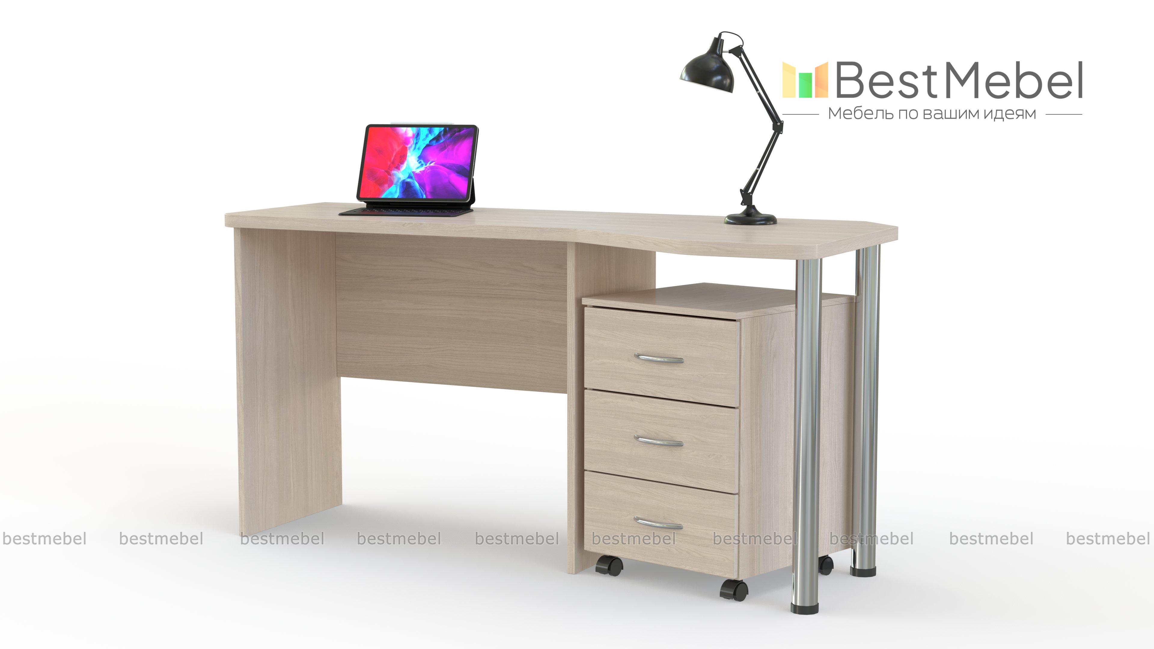 Стол полуугловой Фан-2 BMS поможет учесть особенности планировки и оборудовать комфортное место для работы или учебы. Классический по дизайну, стол выполняется в древесных тонах и оборудован просторной рабочей поверхностью с безопасно скругленными углами. Для размещения в зоне быстрого доступа канцелярских принадлежностей, бумаг и личных вещей предусмотрена мобильная тумба с тремя выдвижными ящиками. Дополнительную устойчивость обеспечивают хромированные опоры. Купить стол полуугловой Фан-2 BMS недорого приглашаем в наш интернет-магазин.