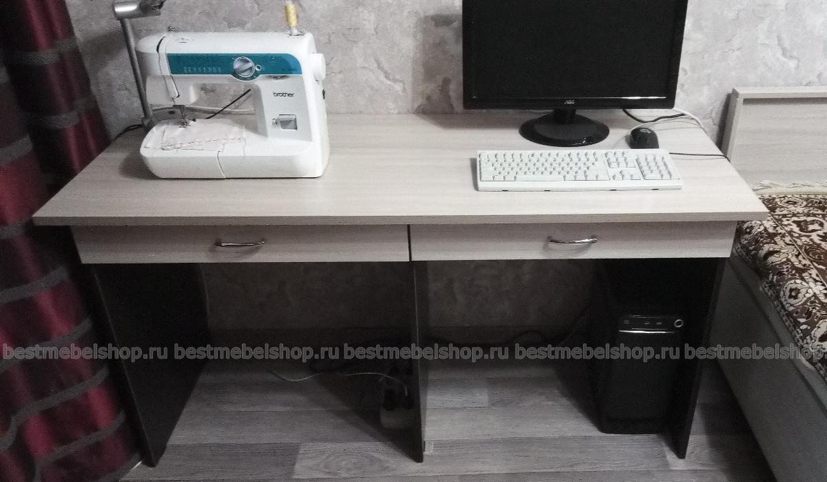 Заказ 00000707913.В продолжение "линейки" для спальни искали необычный стол. Жена увлекается домашним шитьем, а так же у нее есть свой ПК. Поэтому выбор сразу пал на столы формфактора "тандем". Очень удобно и вроде как один компактный конструктив, зато два рабочих места под необходимые задачи). Нашли то, что нужно, немного поиграв с расцветкой и конструкцией. Стол должен быть солидным, поэтому заказали толстую столешницу. Удобным посчитали и внутреннюю разбивку ящика на несколько отделений. А то бы так все в одном объеме и болталось...