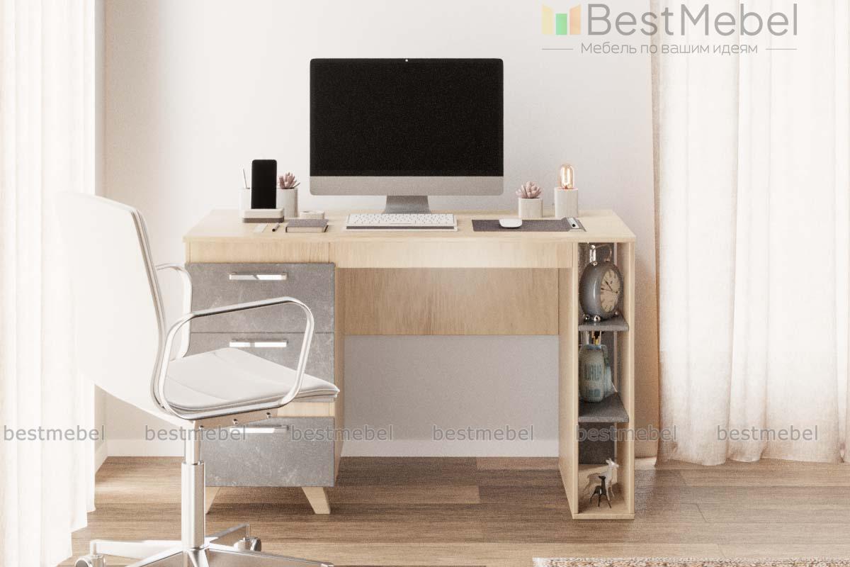 Стол письменный Дантес 3 BMS гармонично впишется в интерьеры с элементами стиля лофт. Модель оборудована прямоугольной просторной столешницей, тумбой с выдвижными ящиками для хранения канцелярских принадлежностей и опорным стеллажом с полками для книг или папок с документами. В оформлении модели скомбинированы древесные тона и имитация поверхности бетона. Купить стол письменный Дантес 3 BMS и оборудовать комфортное рабочее место вам поможет наш интернет-магазин.
