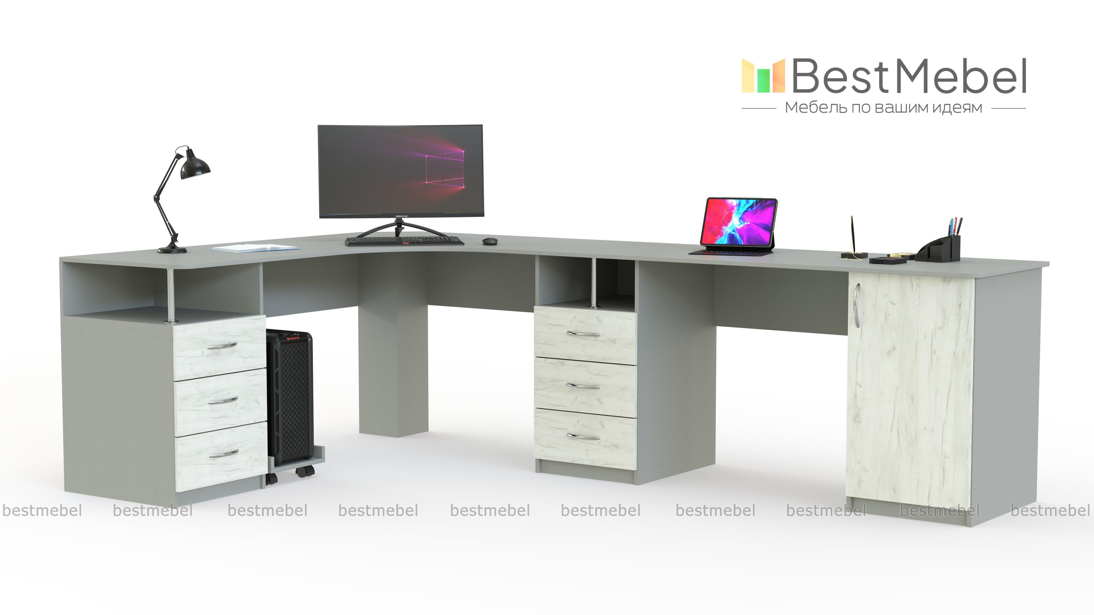 Угловой письменный стол для двоих Пилот 69 BMS имеет практичную Г-образную форму, которая позволяет сэкономить пространство. Просторная столешница опирается на три тумбы – распашную и две оборудованные выдвижными ящиками, для монитора предусмотрена надстройка, а для системного блока – мобильная подставка. Выполненный в древесных тонах, стол гармонично дополнит интерьеры разного типа. Купить угловой письменный стол для двоих Пилот 69 BMS вы сможете в нашем интернет-магазине по доступной цене.