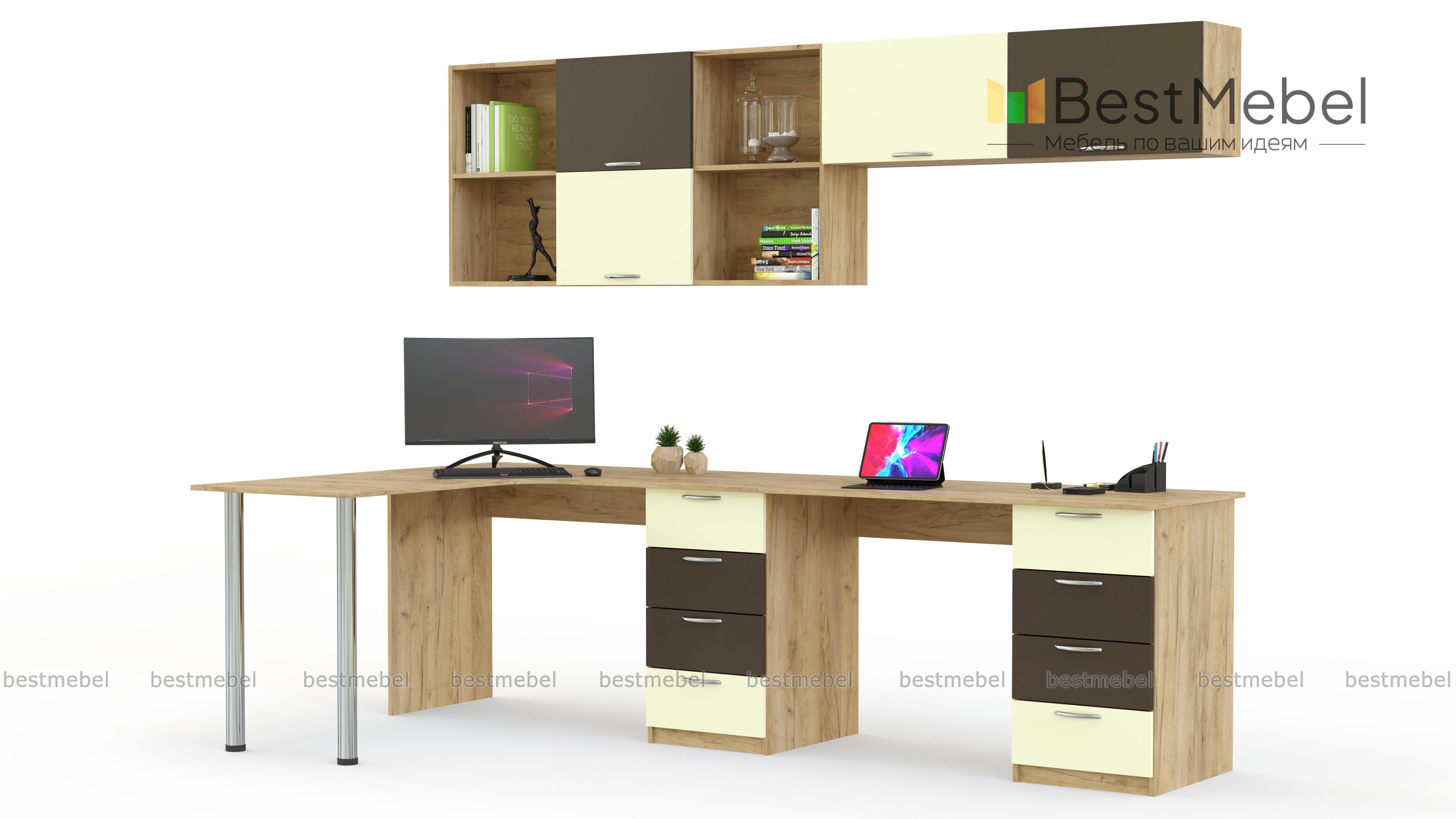 Угловой письменный стол для двоих Виктория 20 BMS имеет практичную Г-образную форму, позволяющую сэкономить пространство. Выполненная в сочетании светлых древесных тонов корпуса и контрастных фасадов, композиция гармонично впишется в интерьер детской. Для удобного хранения канцелярских мелочей, учебных материалов и принадлежностей для творчества предусмотрены две тумбы с выдвижными ящиками и навесная книжная полка. Купить угловой письменный стол для двоих Виктория 20 BMS вы всегда сможете в нашем интернет-магазине.