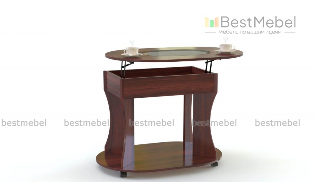 Журнальный стол Безе 7 BMS украсит современную гостиную и поможет сэкономить на лишней мебели. Столик с подъемным механизмом столешницы вы сможете использовать для сервировки, работы, размещения книг и предметов декора. Модель с овальной рабочей поверхностью, декорированной стеклянной вставкой, и фигурными опорами выполнена в насыщенных древесных тонах и дополнена колесиками для мобильности. Купить журнальный стол Безе 7 BMS приглашаем к нам в интернет-магазин.