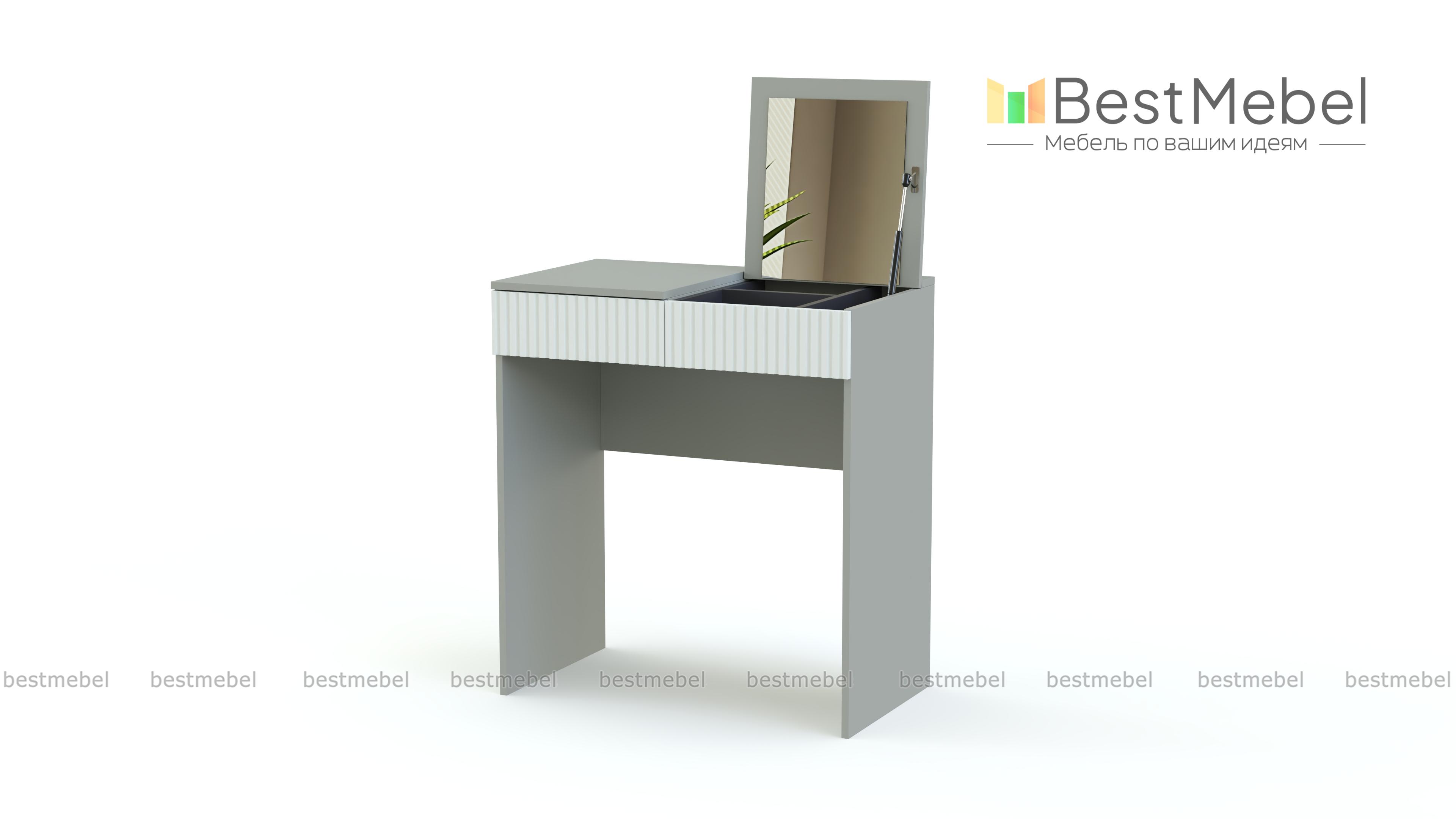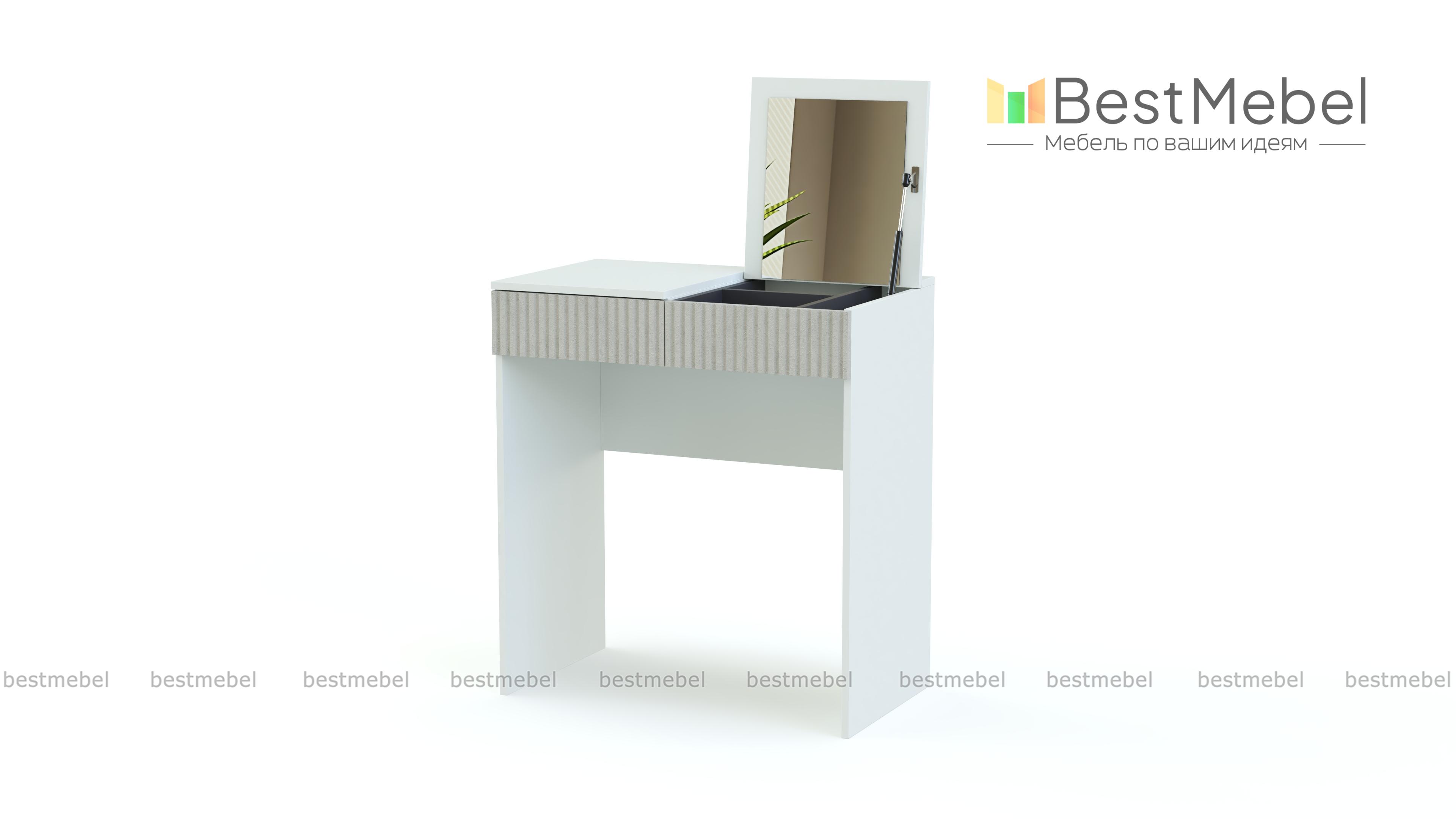 Стол туалетный Осло 12 BMS с фактурным фасадом станет находкой для маленьких спален и студий. Благодаря простой форме и минималистичному дизайну столик легко вписывается в помещения любой планировки и комбинируется с другой современной мебелью. Откидная крышка столешницы, под которой скрыты зеркало и отсек для косметики, позволяет использовать стол как рабочий или макияжный. Купить стол туалетный Осло 12 BMS вы сможете в нашем интернет-магазине с учетом оптимальных размеров.