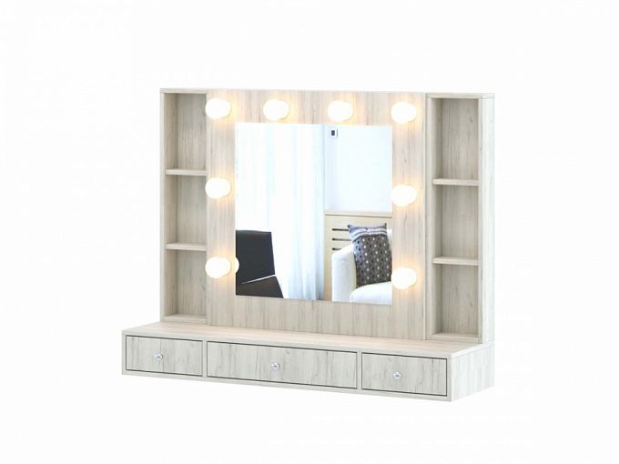 Туалетный стол Дастин 15 BMS оборудован удобной системой хранения для косметики, аксессуаров и прочих важных мелочей. Помимо трех выдвижных ящиков, расположенных под столешницей, конструкцией предусмотрены два боковых открытых стеллажа. Зеркало на центральной панели оформлено по периметру встроенными светильниками, которые обеспечивают равномерное освещение в любое время суток и точное нанесение макияжа. Купить туалетный стол Дастин 15 BMS приглашаем в наш интернет-магазин с выбором цвета и фурнитуры.