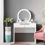 Туалетный столик Дарина 7 BMS украсит современный интерьер и сделает комфортным уход за собой, компактно разместив все необходимые мелочи. Белоснежный макияжный столик оборудован широкой столешницей, двумя выдвижными ящиками для косметики и аксессуаров и круглым зеркалом в окантовке из светодиодных лампочек. Равномерное освещение позволит наносить макияж в любое время дня. Купить туалетный столик Дарина 7 BMS приглашаем в наш интернет-магазин по выгодной цене.
