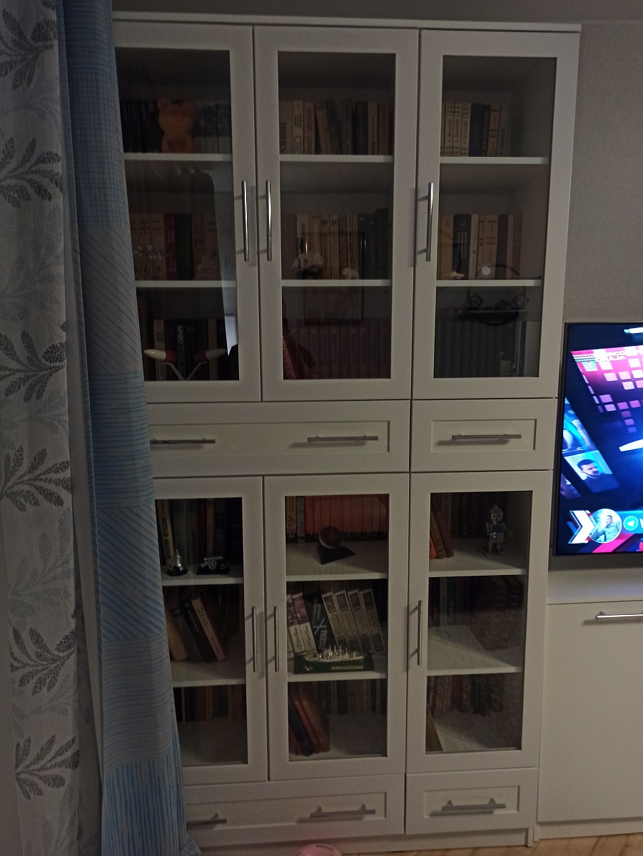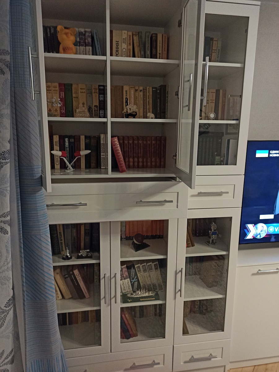 Отличный книжный шкаф. На полках разместилось около полутысячи книг, а в ящиках документы, фотоальбомы и прочие мелочи. Возможность выбрать размеры, конфигурацию и цвет сделал шкаф индивидуальным.