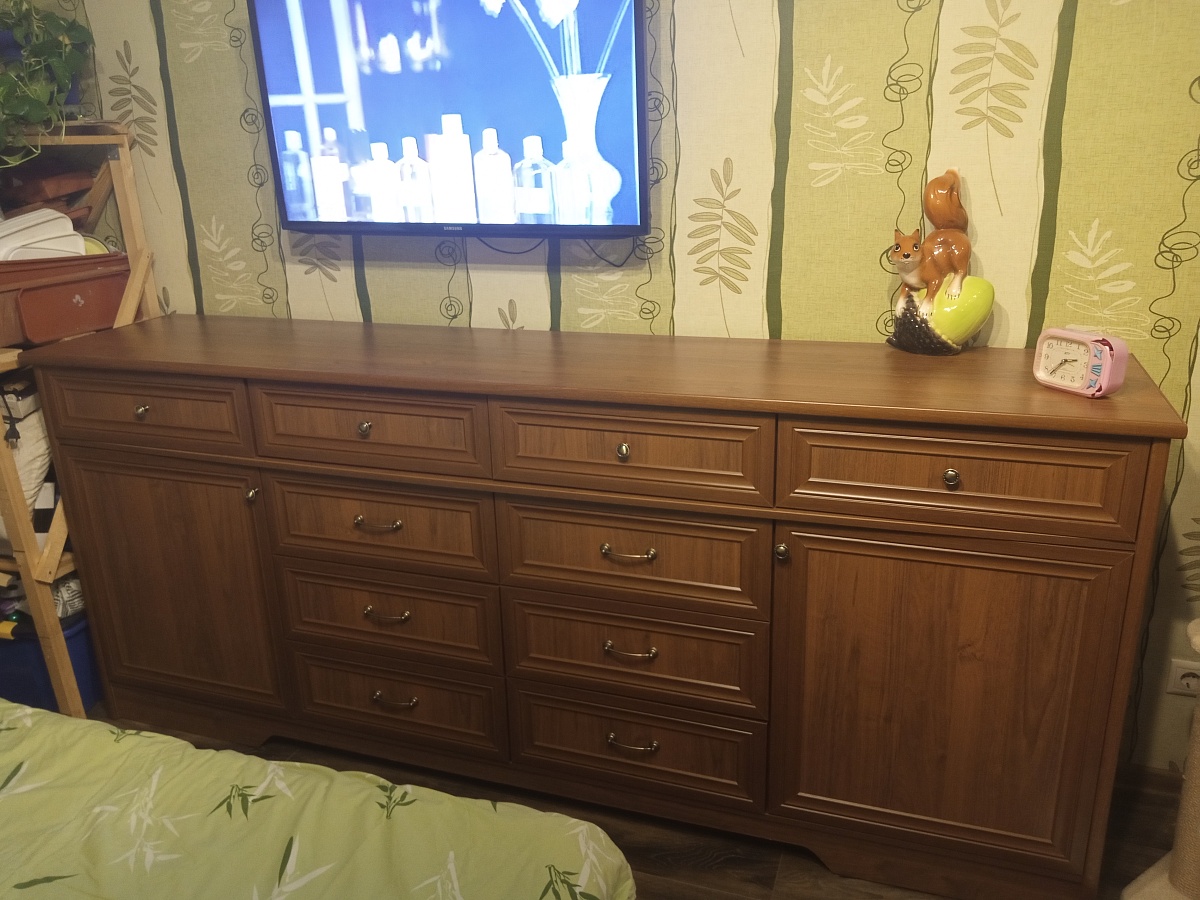 Долго искала большой комод на заказ, чтоб функционал был такой, как мне надо, пришлось ехать в магазин, для более подробной консультации, и выбора образцов наглядно, по качеству, цвету и.т.д, в итоги: после долго подбора, остановили на данном комоде, длина, 2.4,высота 1.0,изготовление было 3 дня, инструкция по сборке это вообще песня, лего отдыхает) качество отличное, цвет вообще бомба оказался на деле, понравилось! Что на всех деталях были штрих коды, и описание, что за деталь, (собирали 1.5 дня) однозначно рекомендую!!!!!! Спасибо производителю......))))) надеюсь, что прослужит не один год.