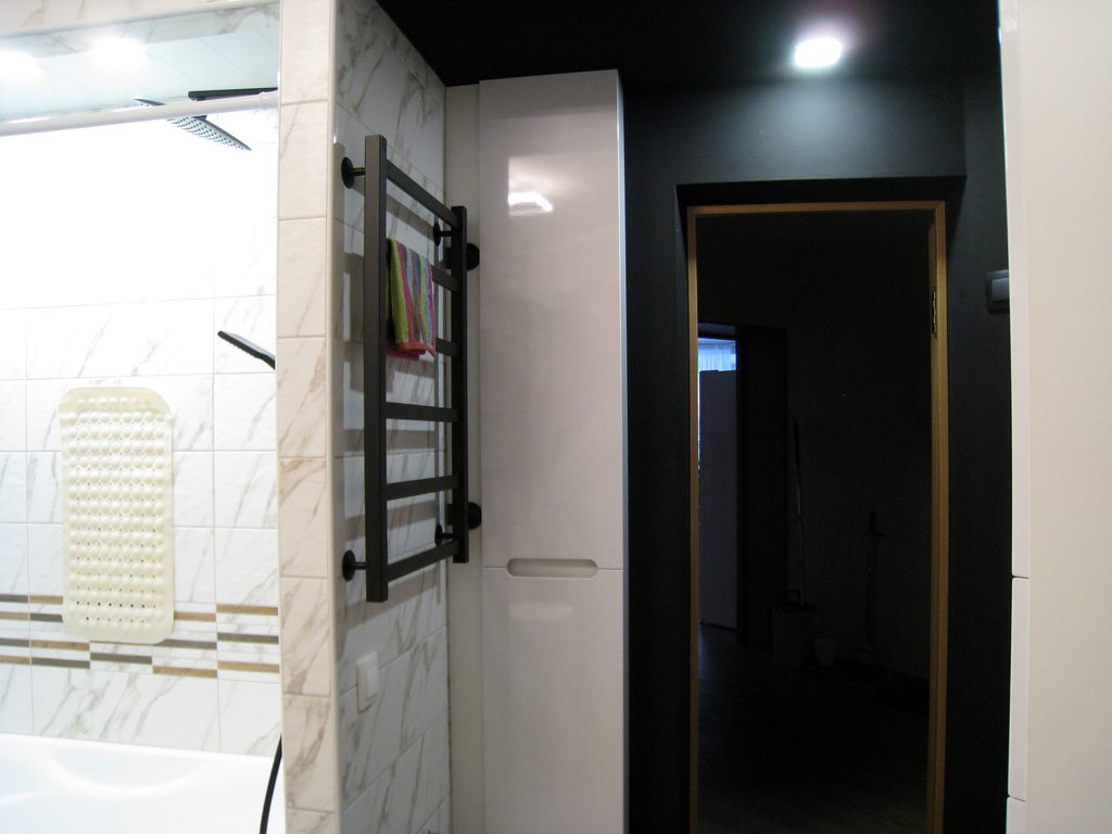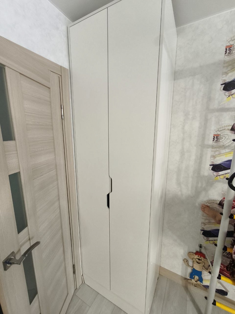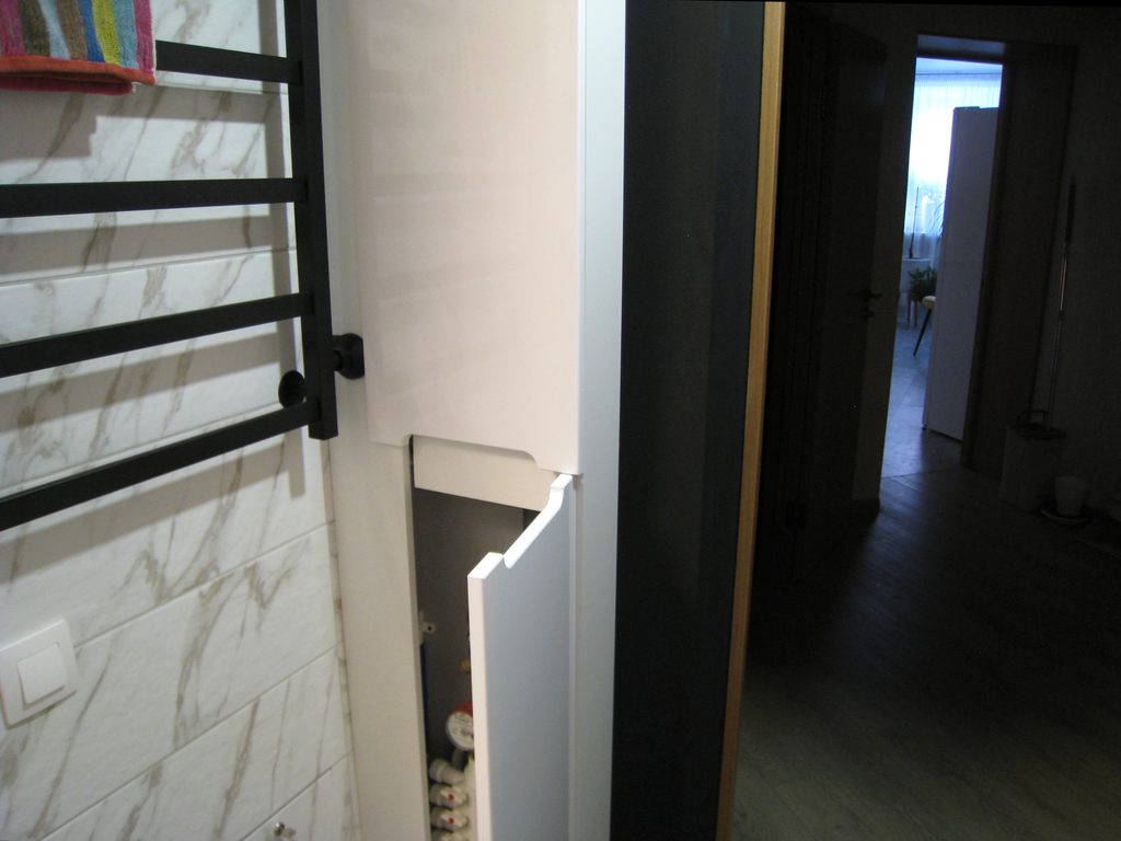 Заказ 00000913112, Пенал в ванную Блейк 5 BMS (330х2270х150).Надо было в ванной прикрыть стояк ГВ со счетчиком и разводкой дверцами определенного дизайна (фасады белый глянец лак, фрезеровка "без ручек").Подошел этот пенал, выполненный по моим размерам, и в моей комплектации. (петли Clip-On с доводчиком, без полок и задней стенки).После подтверждения изменений, заказ привезли через 10 дней. Сборка и установка прошли так, как задумывалось, хотя, конечно, ввиду необычности конструкции (по моей идее одна из боковин пенала повернута параллельно дверцам, и вынимается для легкости доступа) пришлось по месту шаманить самому. Результатом очень доволен, спасибо за широкие возможности для творчества!