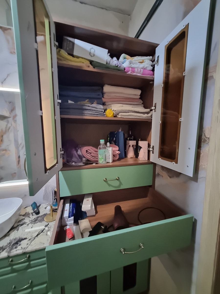 Приобретали пенал по своим размерам. Очень довольна выбором. Изделие очень качественное, красивое и удобное. Заказ 00000275050, изделие ЭСКИЗ Пенал для ванной Ромира 30 BMS (750х2200х520)