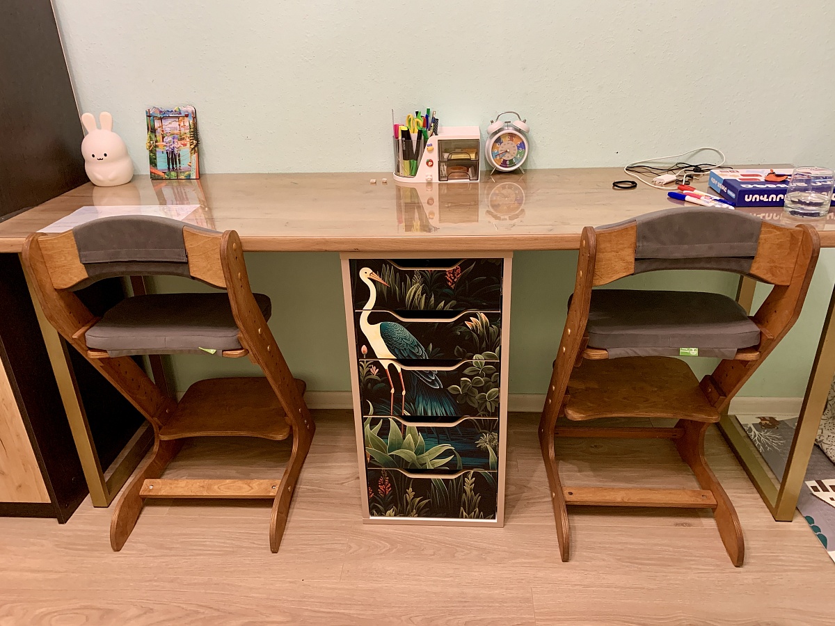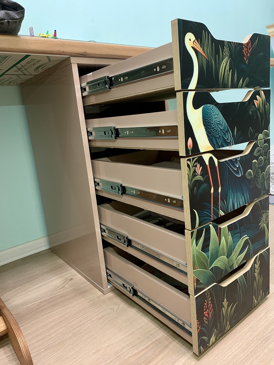 в этом заказе всё индивидуально: глянцевый корпус, в т.ч. задняя стенка, скрытые крепежи, шариковые направляющие с доводчиком, фотопечать, материал мдф. Получилось мощно! Мы довольны. Выполняет функцию разделителя под детским столом.