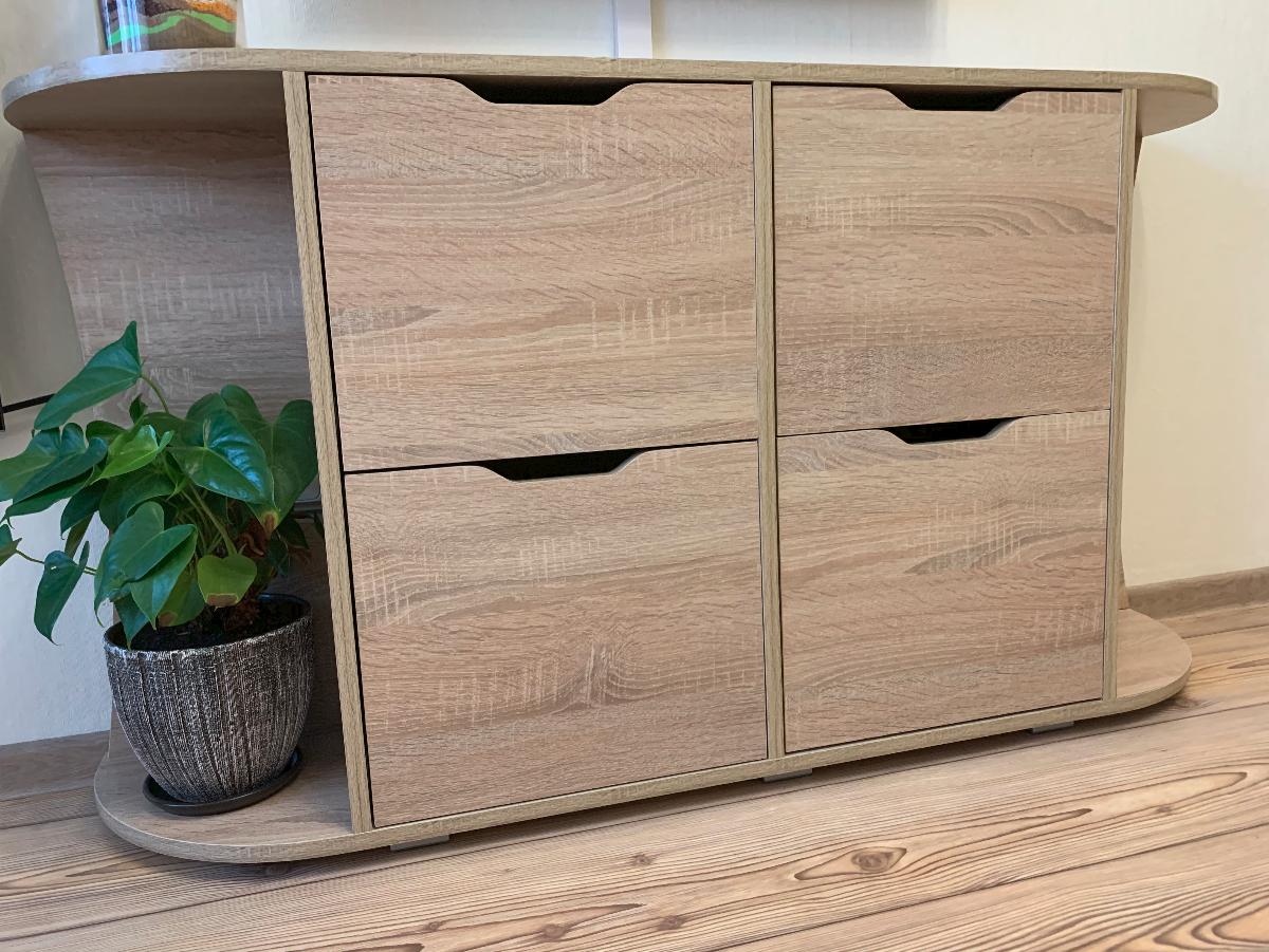 Высокая, вместительная тумба. Комплектацию покупал самую простую. В целом доволен. Есть два типа полок: верхний и нижний ящик, посередине распашная больная полка. Достаточно удобно. Плюс сверху удобно класть мелочи, что должно быть под рукой. За свои деньги очень удобная конструкция. Места занимает мало, хоть и кажется первое время отдельным шкафом, но на самом деле функциональная и удобная тумба.