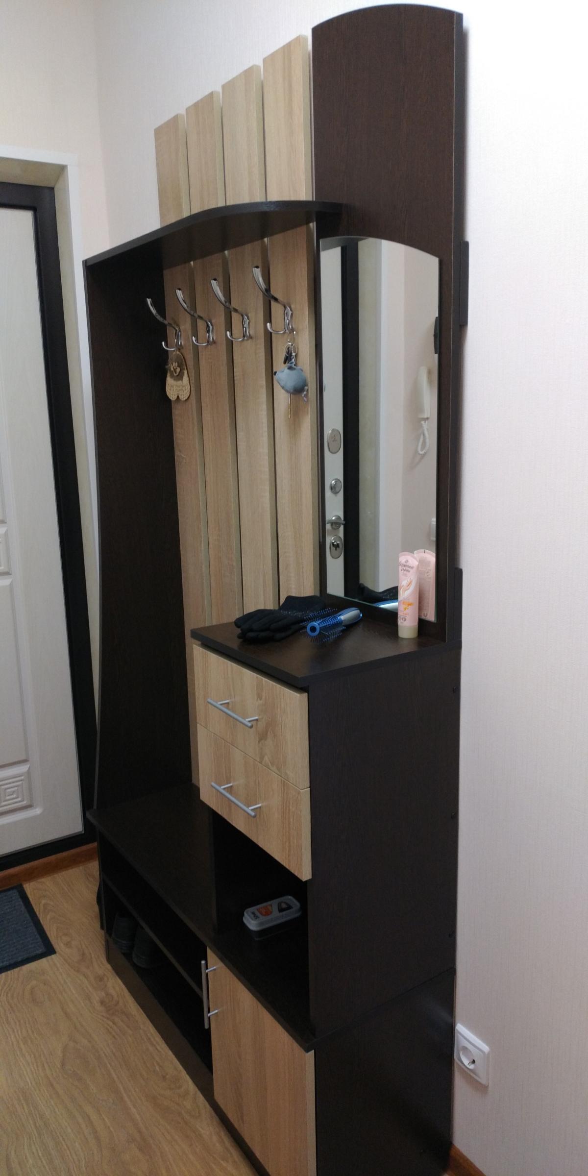 Узкий, компактный, вместительный, занимает мало места, хорошо вписался в простенок