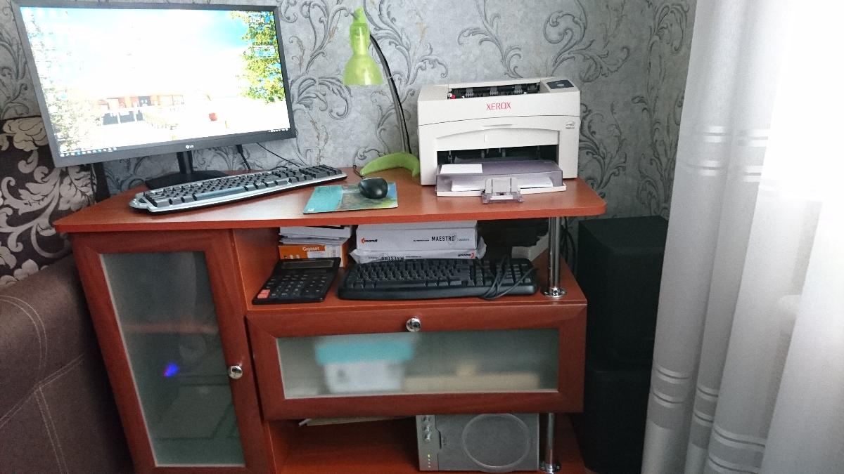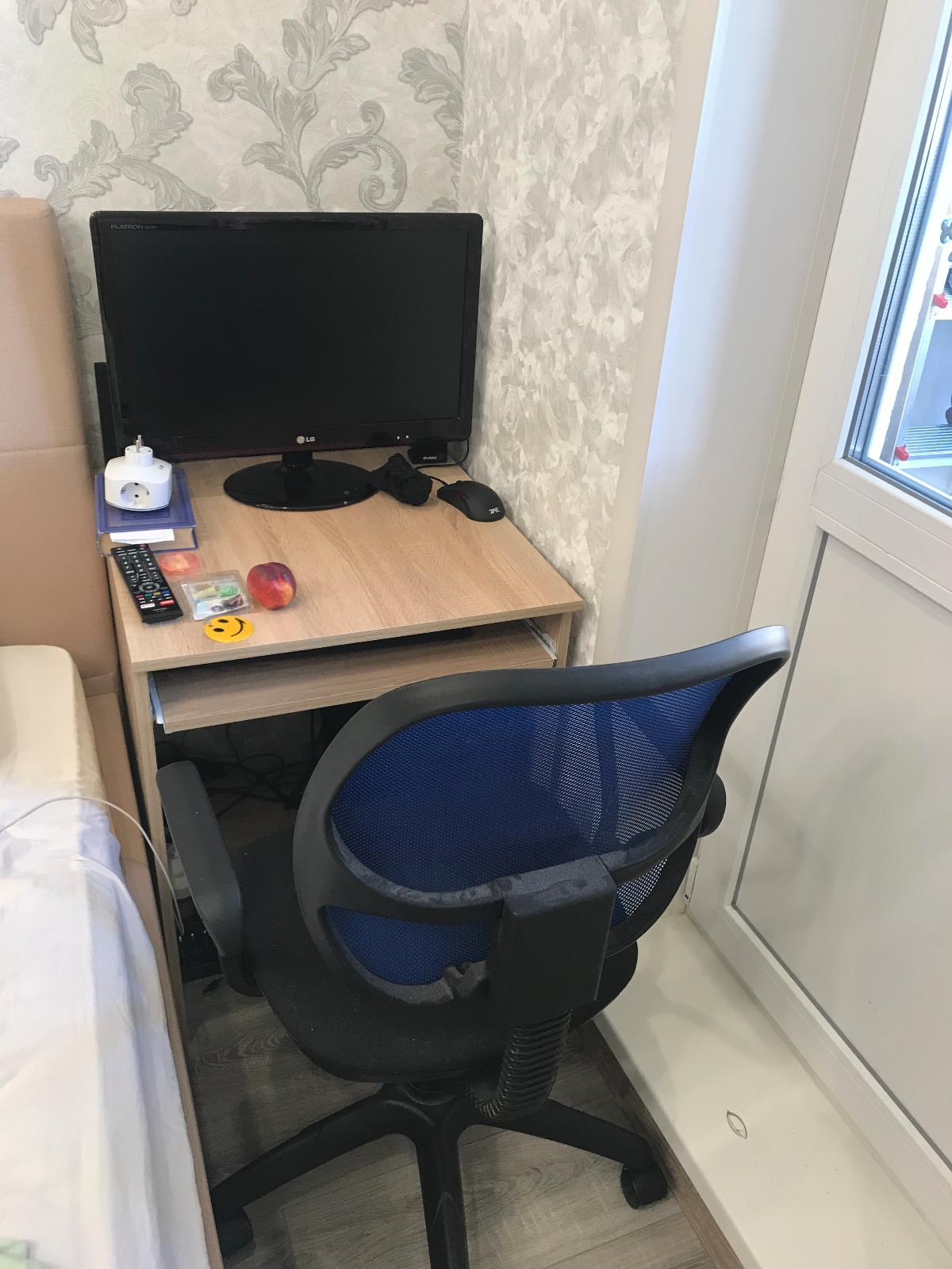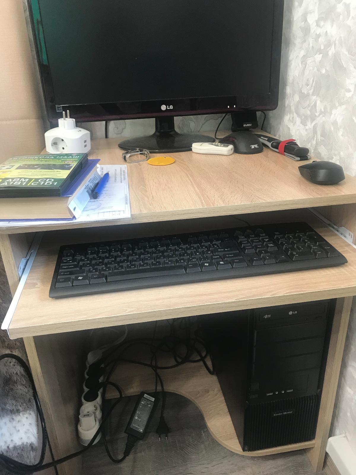 Неплохой компьютерный стол. Нам нужен был небольшой, чтобы встал в оставшееся место возле кровати (60 см).  подкорректировала ширину стола и его цвет корпуса (дуб Сонома) на сайте . Легко и удобно. То, что нам было нужно. При 60 см, конечно, ногам не очень удобно, так как мешает системник, но с выдвижной полкой для клавиатуры получше работать.