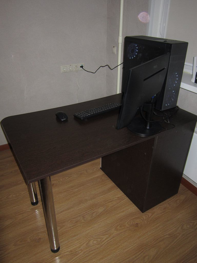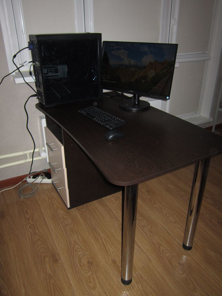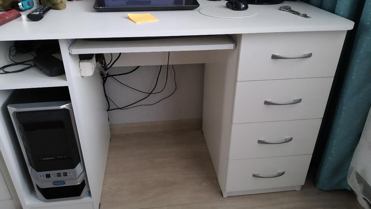 Стол просто отличный. Очень крепкий. Соединительных болтов не жалели.  Полка для клавиатуры удобная.  Очень вместительный. Цвет белое дерево, ламинирование качественное.  Пользуюсь 2,5 месяца. Все нравится. Рекомендую.