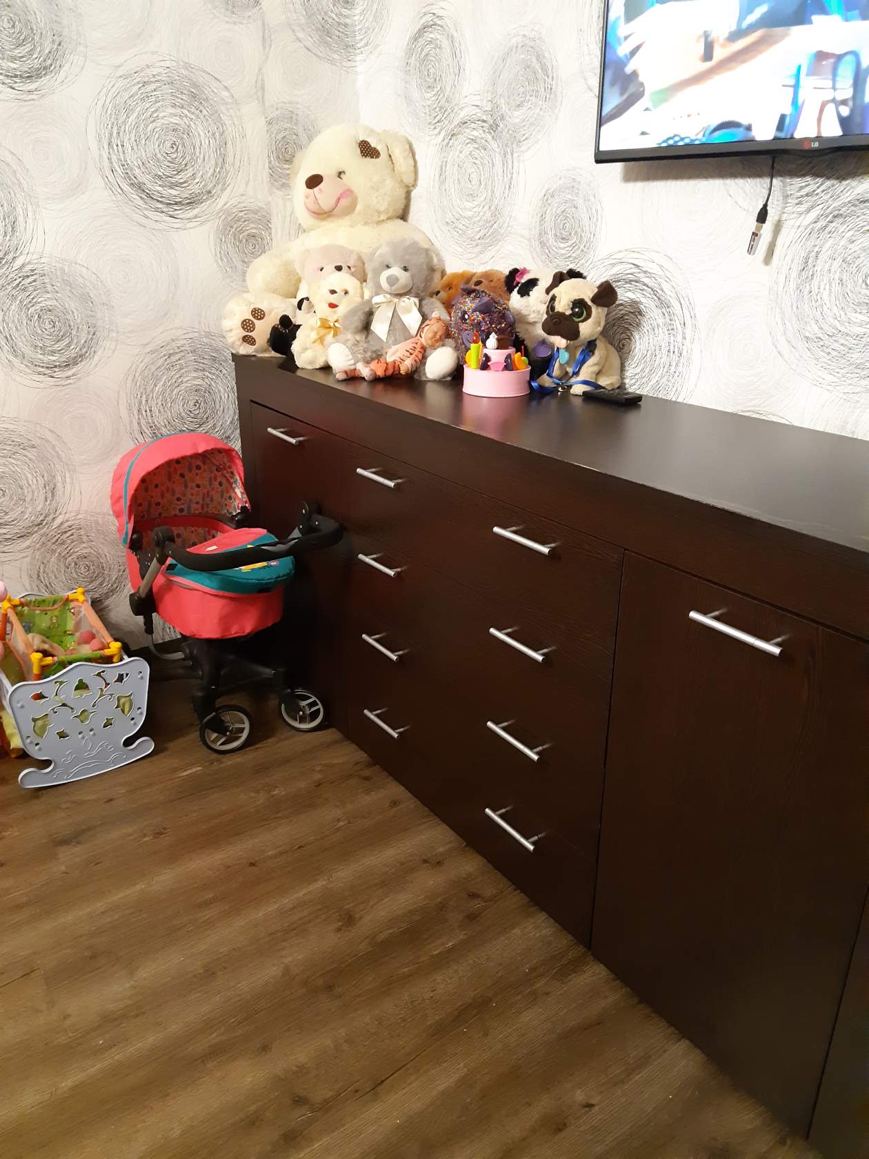 Комод очень вместительный, покупали ребенку для вещей, А поместились еще и игрушки. Ребенок доволен,я тоже. цвет дорогого венге, смотрится дорого. покупали в августе, доставка в срок. собрали сами за час. ни разу не пожалела о покупке.