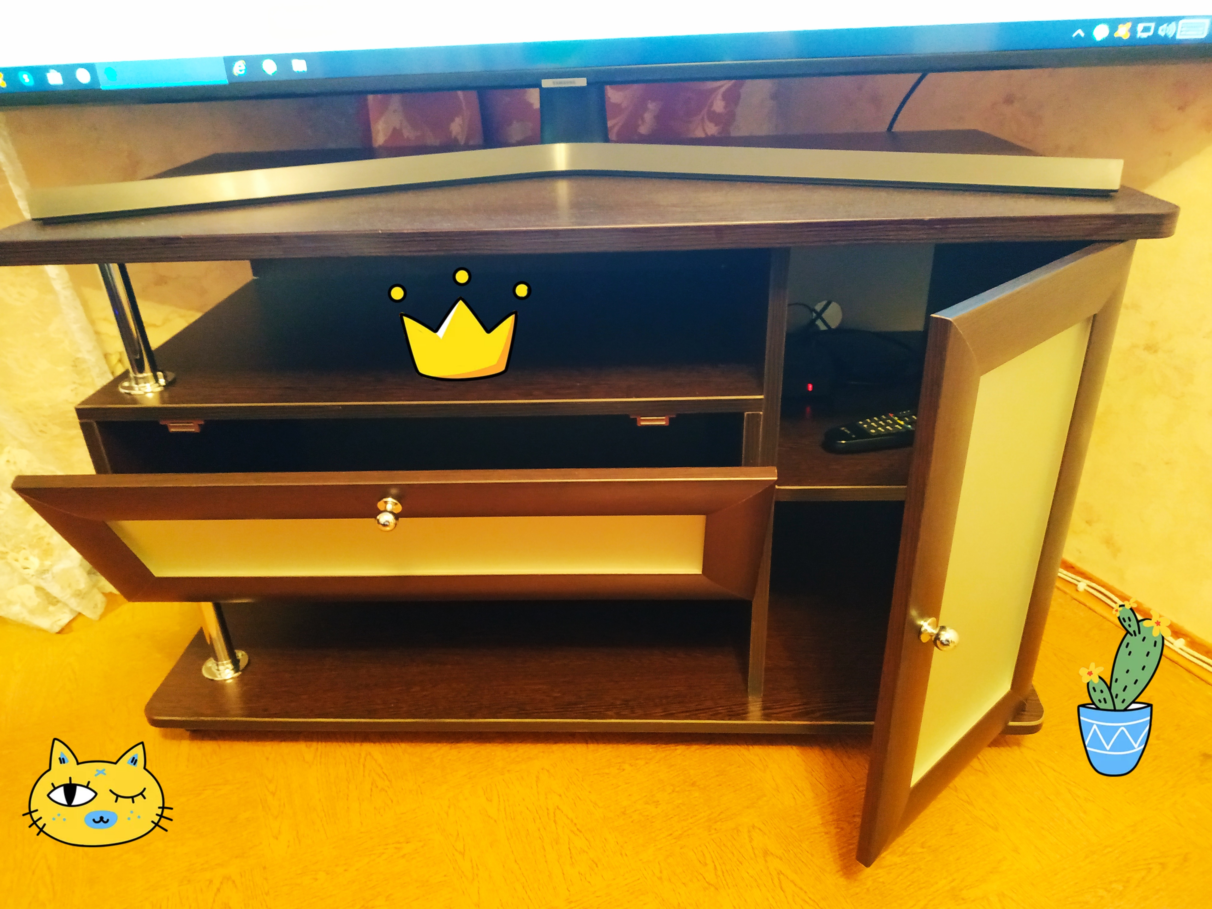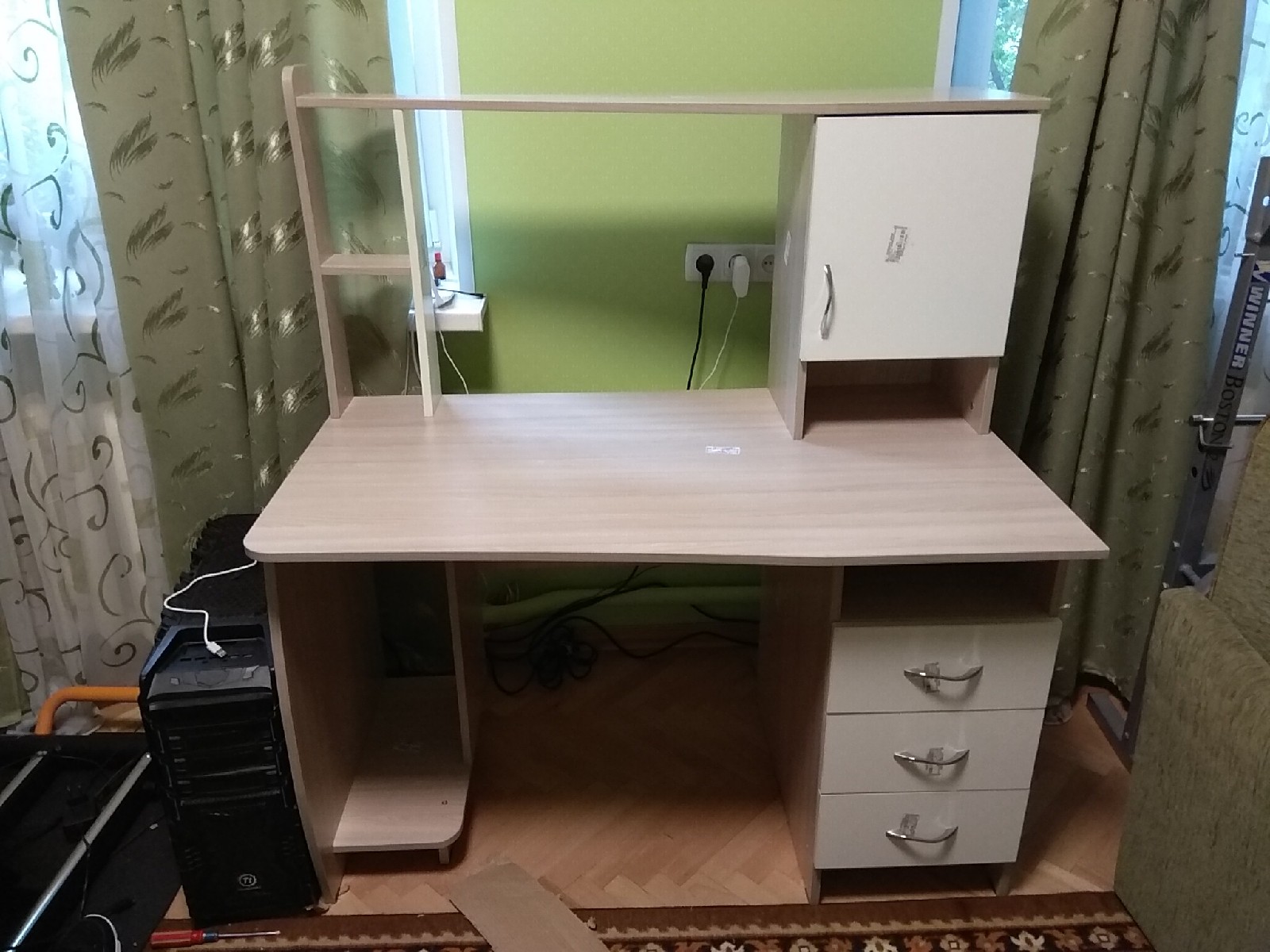 Приобрел этут чудесный стол летом, по функционалу устраивает, правда не рассчитал системный блок, который не стандартных размеров, в итоге не хватило пары миллиметров, с молотком зайдет, но на это рука не поднимается. Жаль, что нет выдвижной полки для клавиатуры.