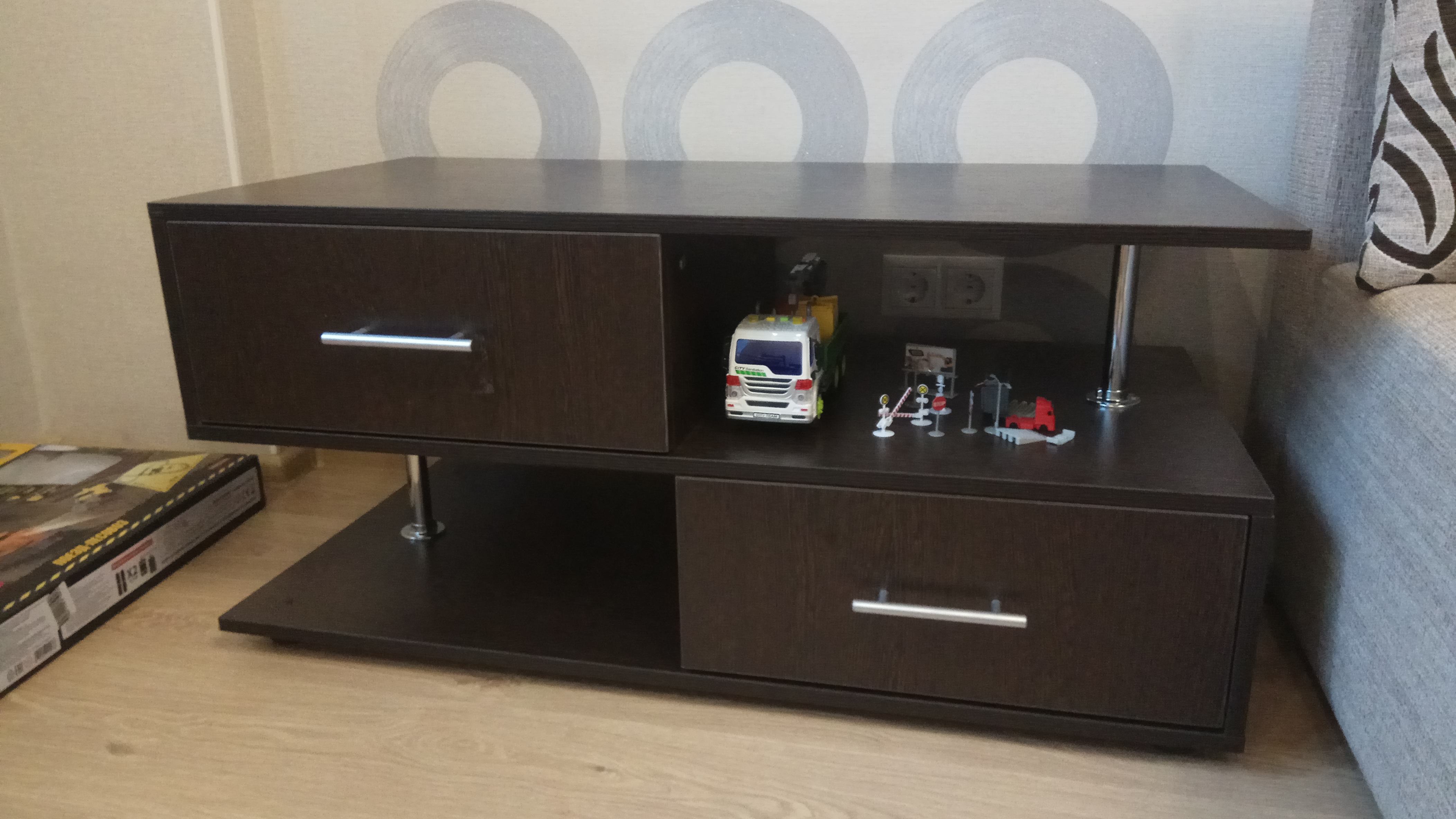 Заказывала в цвете венге, с кромками 2мм в стандартном размере. Все детали ровные, без сколов, кромки приклеены ровно. Ящики глубокие, направляющие заказала обычные, но они гладко и негромко закрываются. Ножки классные: толстые пластмассовые цилиндры высотой около 2см.За счет открытых полок выглядит легким, но стол тяжелый, больше как тумба, а не журнальный стол. Лучший вариант за свою цену.Один нюанс - к каждой детали приклеены наклейки с параметрами, это очень упрощает сборку - это плюс. Но наклейки очень трудно оторвать, клей сложно отмыть. На темном - не видно, а вот если белый заказать, могут следы остаться.