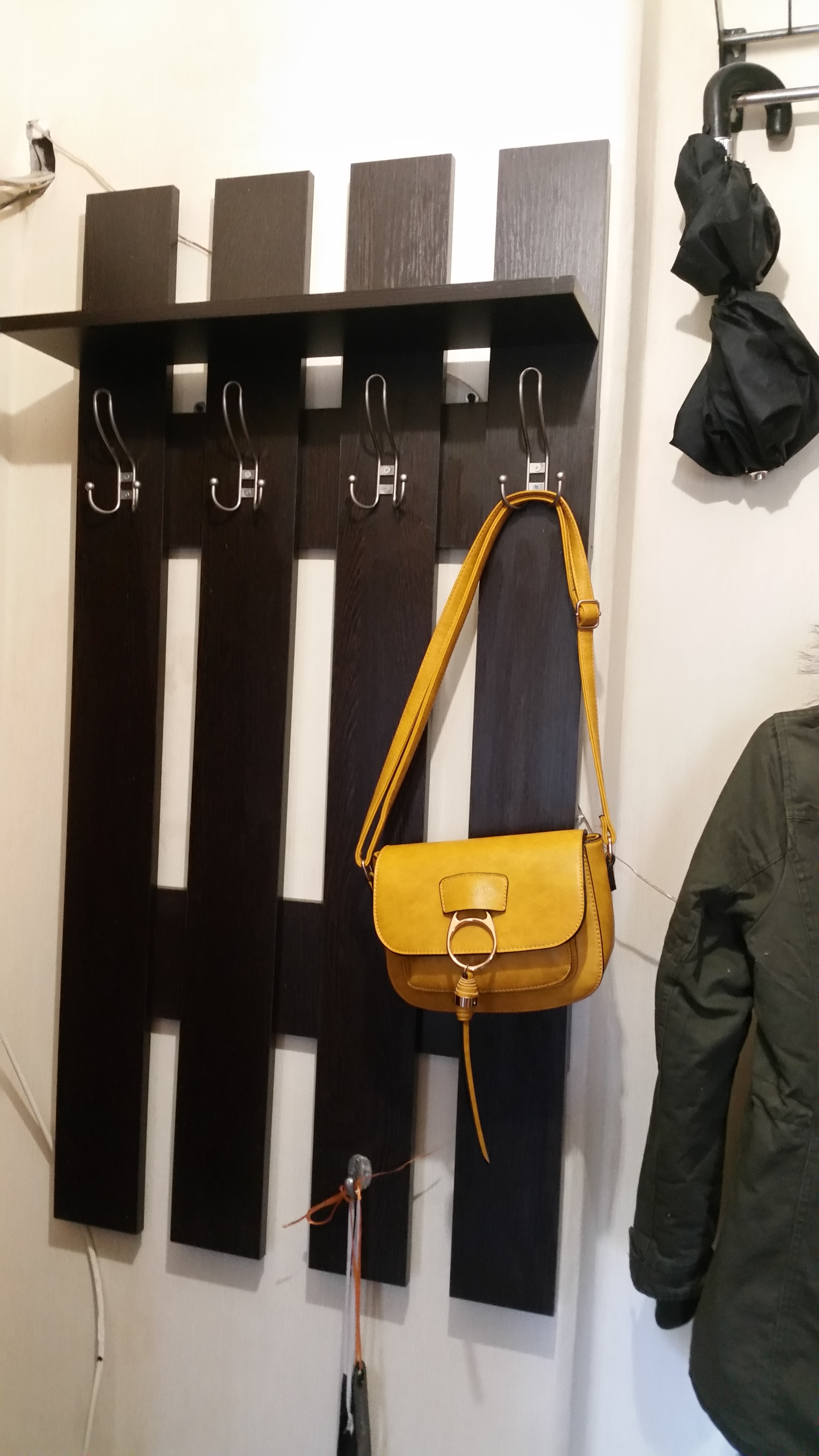 Вешалка очень удобная. Красиво выглядит. Отлично вписывается под любую мебель. Подходит для небольших прихожей. Я получила ее в подарок за 1 рубль при заказе прихожей и туалетного столика. Очень ей довольна!